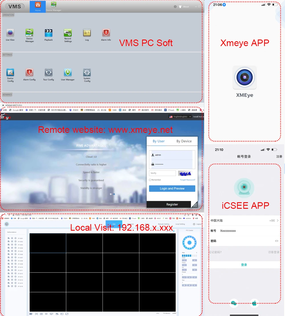 PC Soft,Tablet,phone remoteSupport the PC Soft CMS, remote website www.xmeye.net, iPhone/ Android Phone APP XMeye