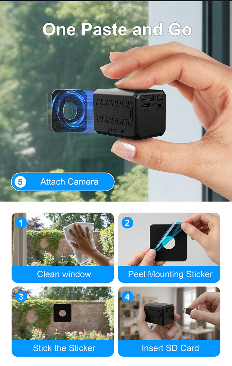 Complete setup in 4 steps: clean the window, peel the mounting sticker, stick to fix, and insert the SD card. No complex tools required—simple and efficient.